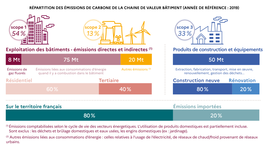 L’empreinte carbone de la filière du bâtiment en 2019 représentait 25% de l’empreinte annuelle de la France avec la répartition suivante: