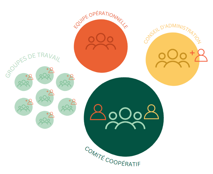 Le comité coopératif est constitué d’un membre de chaque groupe de travail, des membres de l’équipe opérationnelle et des représentants du CA.